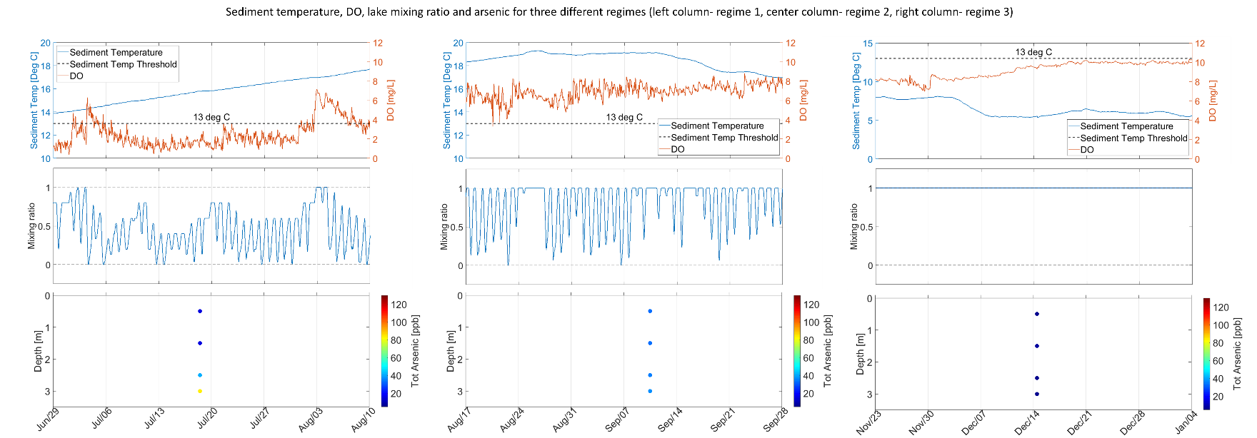 Fig 2. Six-week plots of sediment temperature, DO, lake mixing ration, and arsenic. The three seasonal regimes, identified are shown–regime 1 (left), regime 2 (center) regime 3 (right).