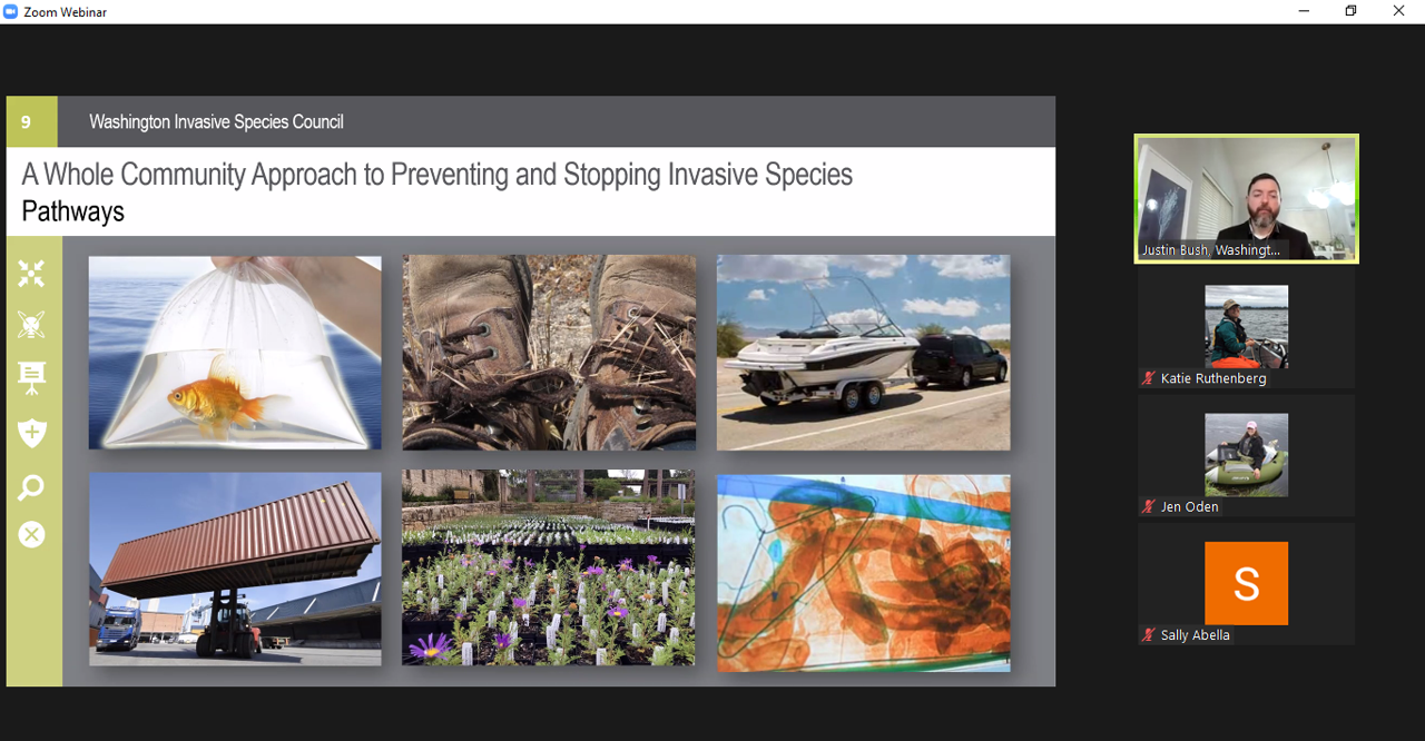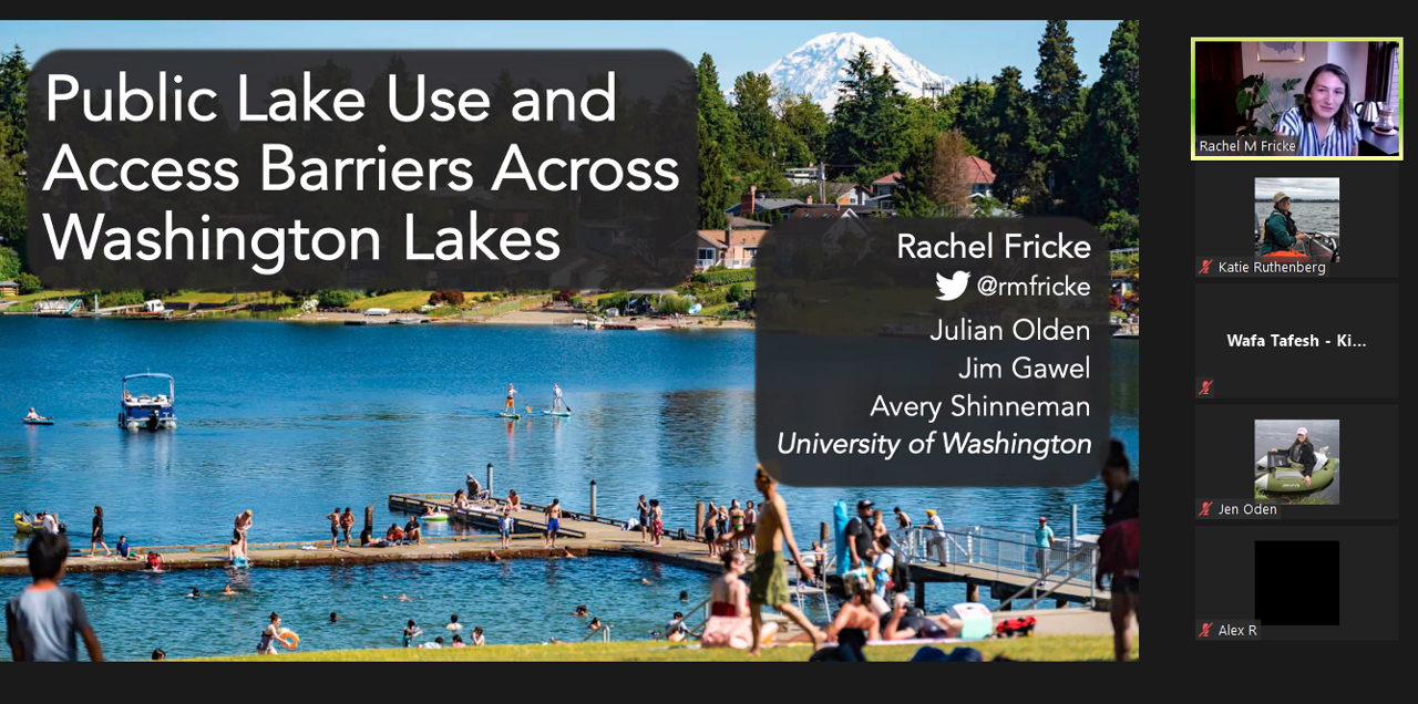 We concluded Thursday with our annual business meeting and a social hour. After thanking our conference sponsors (see below), I summarized the accomplishments of each WALPA committee for the previous year, covering ongoing conference planning, board nominations, and newsletter and social media outreach. Legislative committee achievements included support of HB 1152 for health department funding of toxic algae program, SB 5141 for environmental justice, and Washington State Invasive Species Council renewal. Our diversity/equity/inclusion committee conducted a member demographic survey and developed a meeting code of conduct. The citizen outreach committee is planning a western regional conference (online) for the lake community, and WALPA has partnered with WDFW to train lake managers on AIS decontamination procedures.