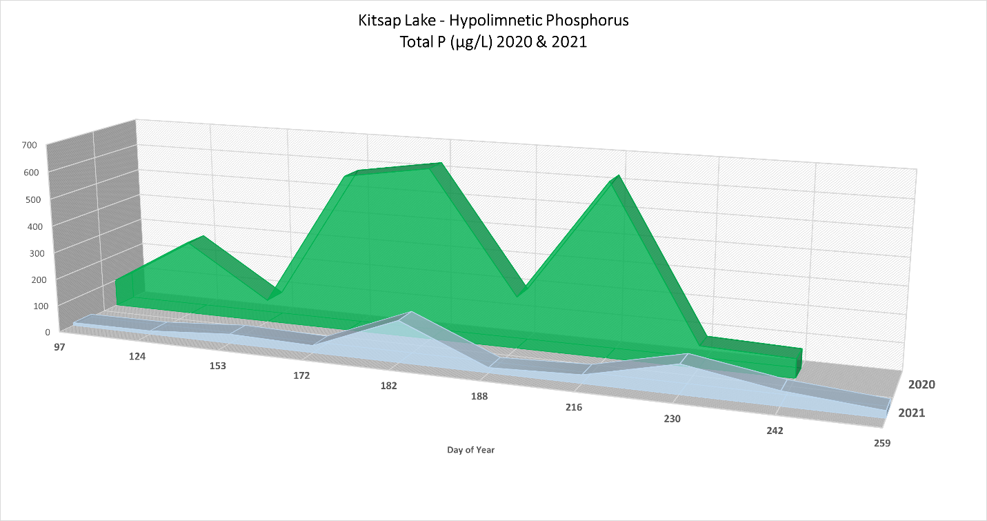 Hypolimnetic phosphorus levels were reduced dramatically by targeting sediments in the deeper portion of the lake. In August of 2020, total phosphorus was reduced from 600 ug/l to under 40 ug/l. In the summer of 2021, total P levels maintained low levels in the 30-40 ug/l range.