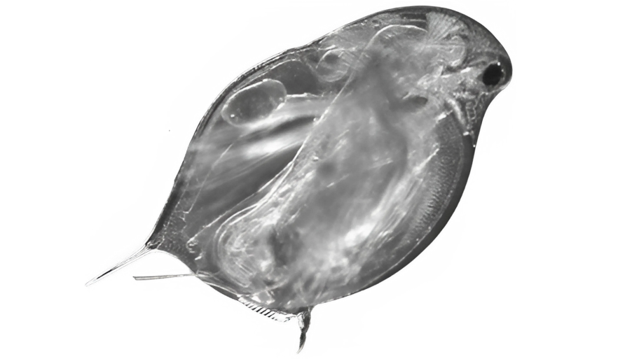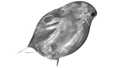 Photo of a female Daphnia pulicaria from American Falls Reservoir, Idaho. The abdominal claw is visible on the left, and an egg is visible in the brood chamber. (Image by Brianna DeCora)