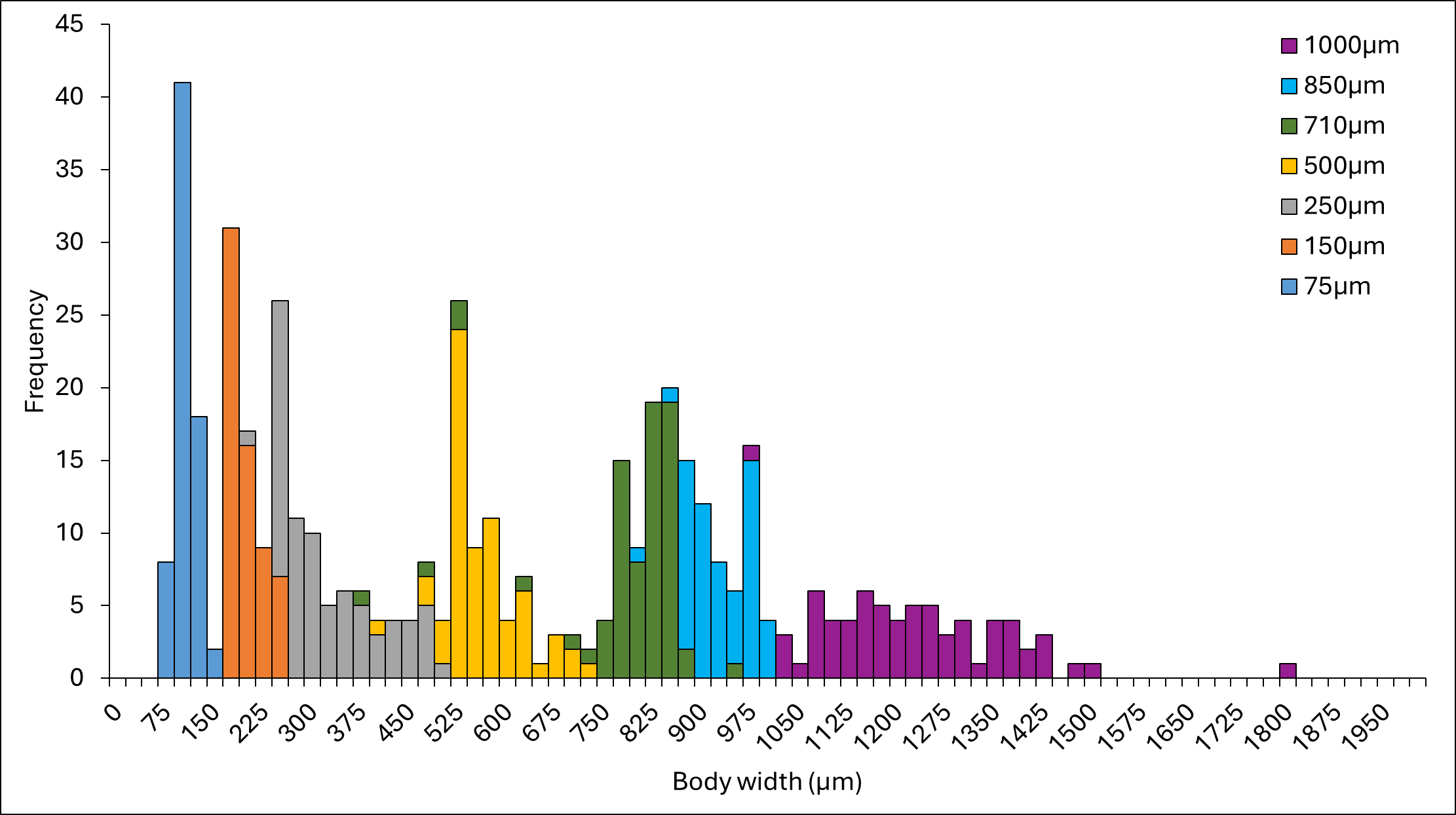 Figure 1. Length-frequency distribution of zooplankton by body width (µm) across seven mesh sizes, showing that body width best predicted passage through each sieve.