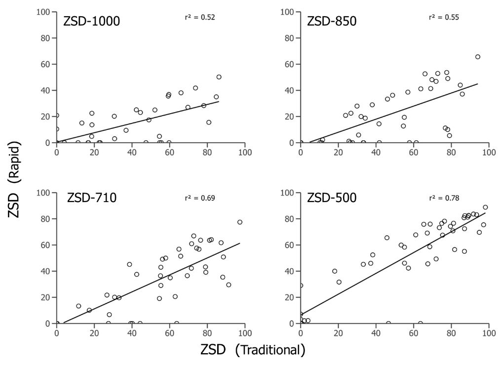 Figure 2. Zooplankton size distribution proportion comparisons for both traditionally estimated biovolume and rapid volumetric estimates, showing highest r2 value (0.78) for ZSD-500.