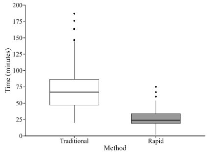 Figure 3. Comparison of processing time showing an average time of 70.4 minutes for traditional methods and 26.1 minutes for the rapid volumetric technique.