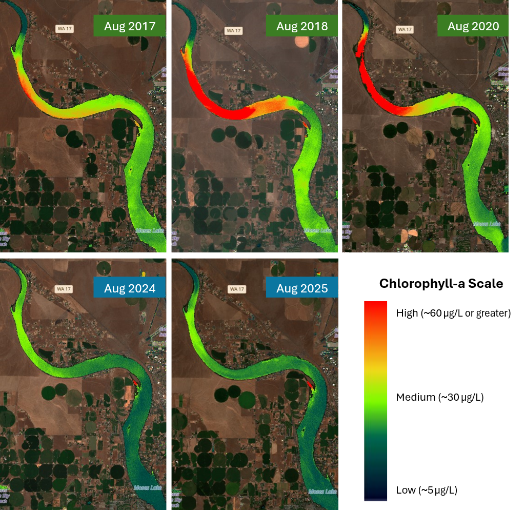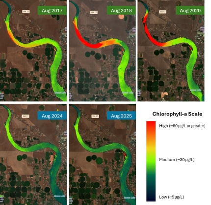 Visual comparison of algae across years with 40-60% CRW mixing during typical peak algae biomass by satellite analyses. Historical years are 2017, 2018, and 2020. Years with P mitigation were 2024 and 2025 demonstrating a significant reduction in chlorophyll-a across Rocky Ford Arm. Images contain modified Copernicus Sentinel-2 data from 2017-2025.