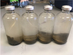 In summer 2019, I started a series of incubation experiments to answer my question. Starting in late May, I took samples of sediment and water from Lacamas approximately every month throughout summer stratification. Back in the lab, I placed the sediment and water in glass vials (Fig. 2), injected a small amount of isotopically labeled 13CH4 gas, and incubated the vials for six hours at in situ temperature. To some of the vials, I also added extra oxygen, CH4, nitrate, or sulfate to determine how these factors influence production or oxidation rates. I took samples to measure concentrations of CH4 and 13CH4 every few hours in all vials. Comparing the concentrations of both gases allows me to calculate methane production and oxidation rates in the vials.
